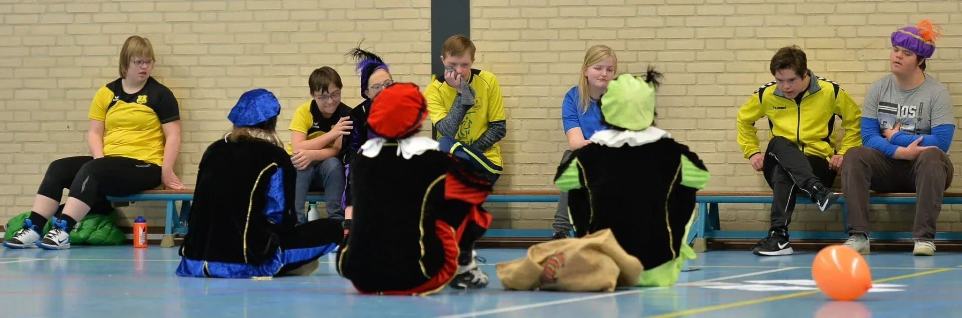 Ook bij het speciaal korfbal kwamen de pieten langs, en er waren weer een paar hulppietjes aanwezig. De pieten deden gezellig mee met de training en spelletjes en in de pauze kregen de kinderen ook hun cadeautjes en pepernoten.