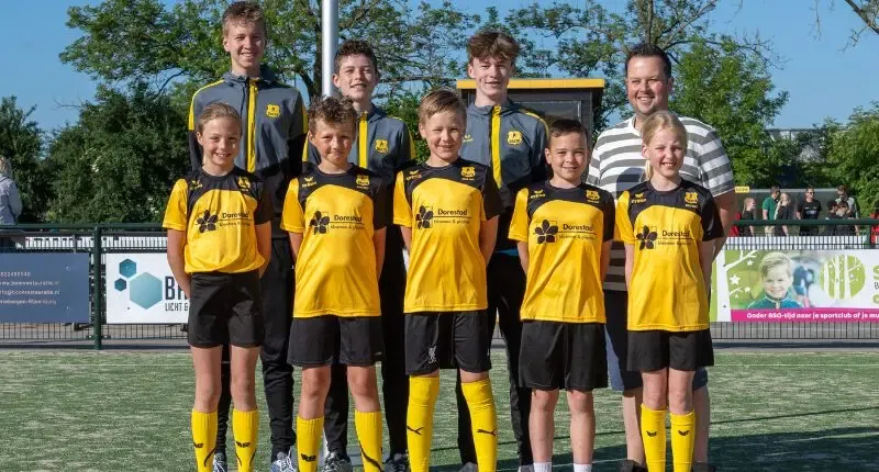 Afgelopen zaterdag was het dan eindelijk zover de spelers van Dalto E-1 mochten op de foto met hun nieuwe sponsorshirts van Dorestad bloem & kado (De Sluis).